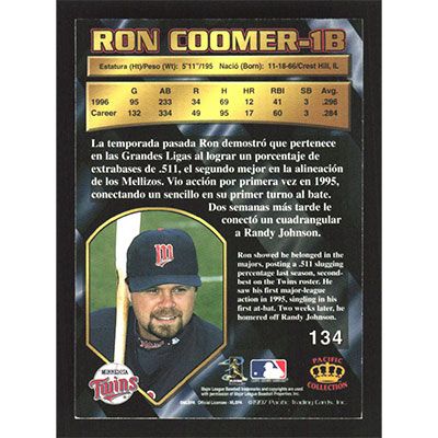 This is a 1997 Pacific Ron Coomer baseball card. The card is #134 and pictures show condition.