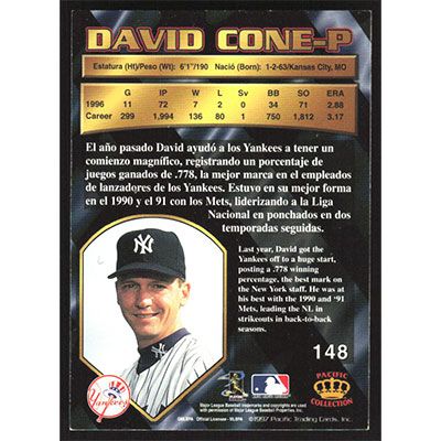 This is a 1997 Pacific David Cone baseball card. The card is #148 and pictures show condition.