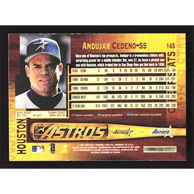 This is a 1997 Pinnacle Andujar Cedeno baseball card. The card is #145 and pictures show condition.