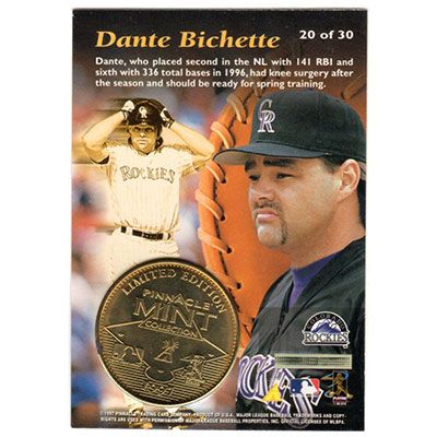This is a 1997 Pinnacle Mint Coins Brass Dante Bichette baseball card. The card is #20 and pictures show condition.