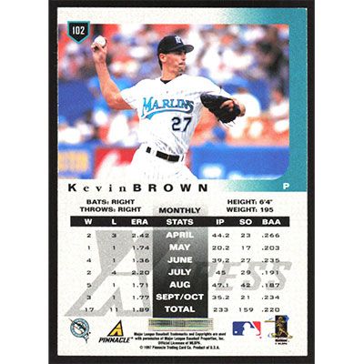 This is a 1997 Pinnacle X-Press Kevin Brown baseball card. The card is #102 and pictures show condition.