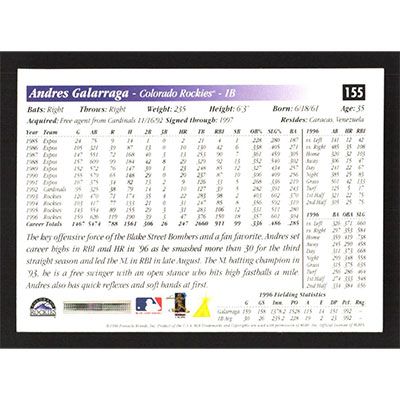 This is a 1997 Score Andres Galarraga baseball card. The card is #155 and pictures show condition.