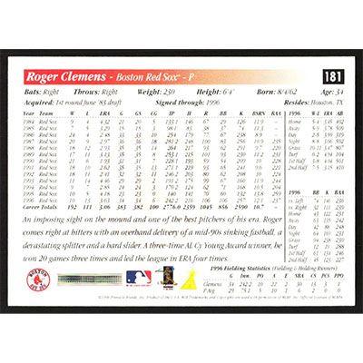 This is a 1997 Score Roger Clemens baseball card. The card is #181 and pictures show condition.
