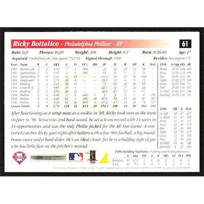 This is a 1997 Score Ricky Bottalico baseball card. The card is #61 and pictures show condition.