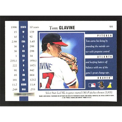 This is a 1997 Select Tom Glavine baseball card. The card is #99 and pictures show condition.