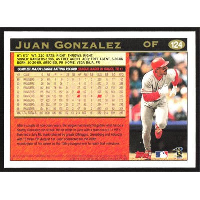 This is a 1997 Topps Juan Gonzalez baseball card. The card is #124 and pictures show condition.