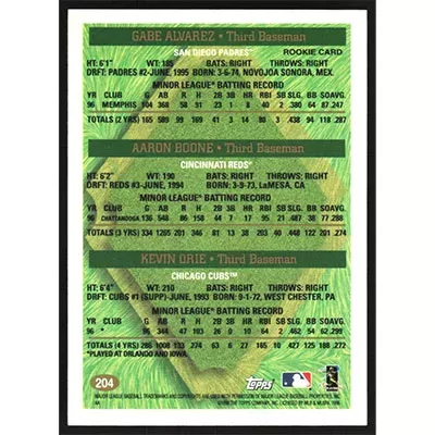 This is a 1997 Topps Gabe Alvarez, Aaron Boone and Kevin Orie baseball card. The card is #204 and pictures show condition. Team(s): San Diego Padres/Cincinnati Reds/Chicago Cubs