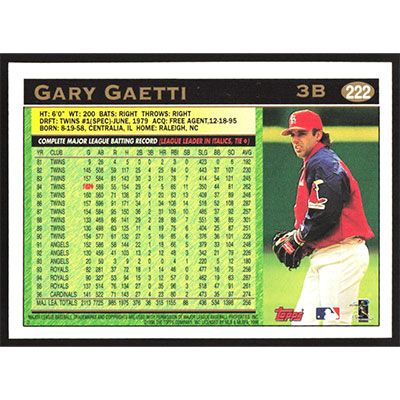 This is a 1997 Topps Gary Gaetti baseball card. The card is #222 and pictures show condition.