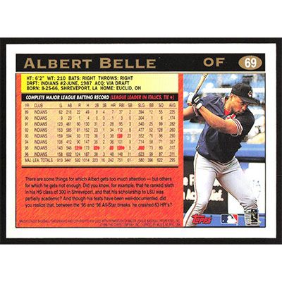 This is a 1997 Topps Albert Belle baseball card. The card is #69 and pictures show condition.