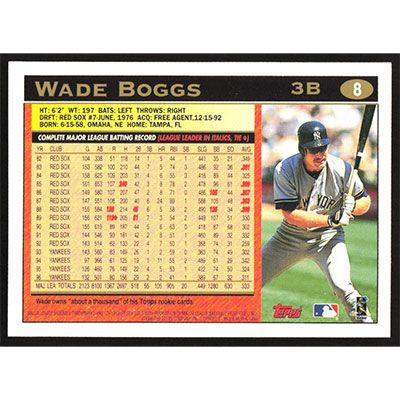 This is a 1997 Topps Wade Boggs baseball card. The card is #8 and pictures show condition.