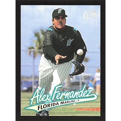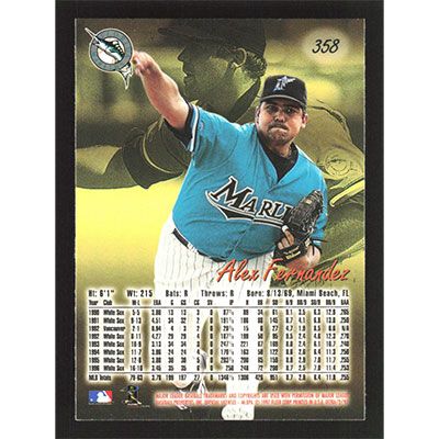 This is a 1997 Ultra Alex Fernandez baseball card. The card is #358 and pictures show condition.