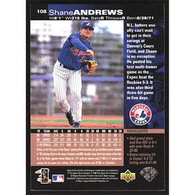 This is a 1997 Upper Deck Shane Andrews baseball card. The card is #108 and pictures show condition.