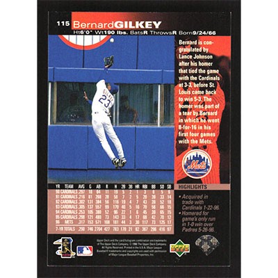 This is a 1997 Upper Deck Bernard Gilkey baseball card. The card is #115 and pictures show condition.
