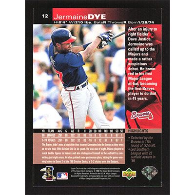 This is a 1997 Upper Deck Jermaine Dye baseball card. The card is #12 and pictures show condition.