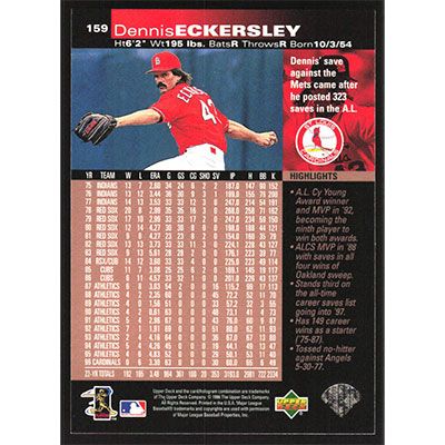 This is a 1997 Upper Deck Dennis Eckersley baseball card. The card is #159 and pictures show condition.