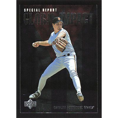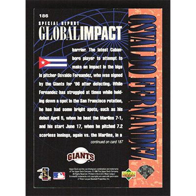 This is a 1997 Upper Deck Osvaldo Fernandez Global Impact baseball card. The card is #186 and pictures show condition.