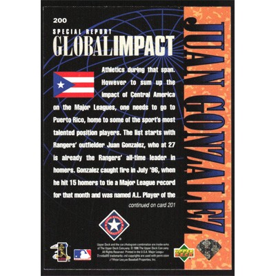 This is a 1997 Upper Deck Juan Gonzalez Global Impact baseball card. The card is #200 and pictures show condition.
