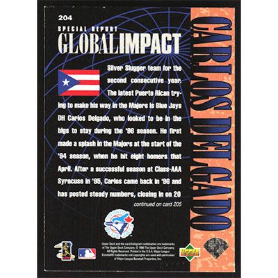 This is a 1997 Upper Deck Carlos Delgado Global Impact baseball card. The card is #204 and pictures show condition.
