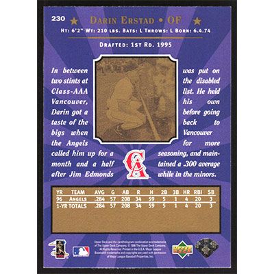 This is a 1997 Upper Deck Darin Erstad Star Rookies baseball card. The card is #230 and pictures show condition.