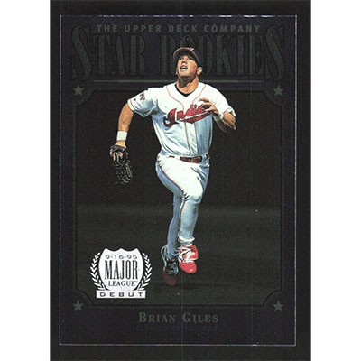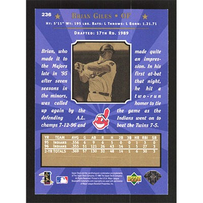 This is a 1997 Upper Deck Brian Giles Star Rookies baseball card. The card is #236 and pictures show condition. Team(s): Cleveland Indians Rookie Card (RC)