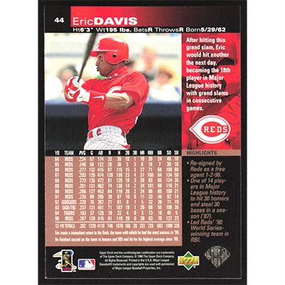 This is a 1997 Upper Deck Eric Davis baseball card. The card is #44 and pictures show condition.