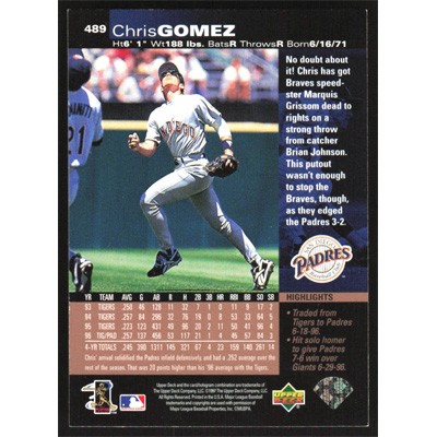This is a 1997 Upper Deck Chris Gomez baseball card. The card is #489 and pictures show condition.
