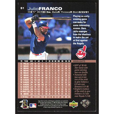 This is a 1997 Upper Deck Julio Franco baseball card. The card is #51 and pictures show condition.