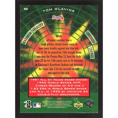 This is a 1997 Upper Deck Tom Glavine Strike Force baseball card. The card is #66 and pictures show condition.