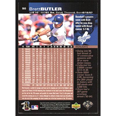 This is a 1997 Upper Deck Brett Butler baseball card. The card is #90 and pictures show condition.
