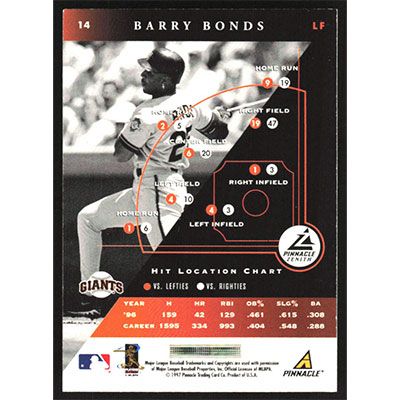 This is a 1997 Zenith Barry Bonds baseball card. The card is #14 and pictures show condition.