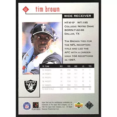 This is a 1998 Black Diamond Rookies Tim Brown football card. The card is #63 and pictures show condition.