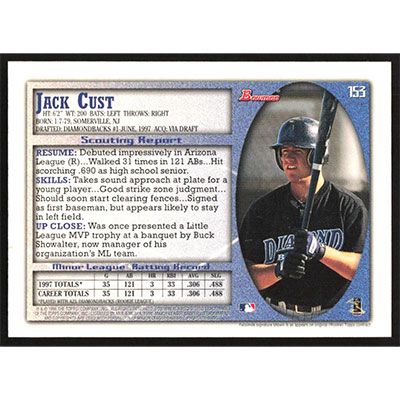 This is a 1998 Bowman Jack Cust baseball card. The card is #153 and pictures show condition.