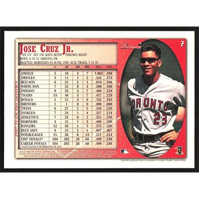This is a 1998 Bowman Jose Cruz Jr. baseball card. The card is #7 and pictures show condition.
