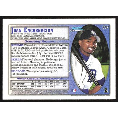 This is a 1998 Bowman Chrome Juan Encarnacion baseball card. The card is #297 and pictures show condition.