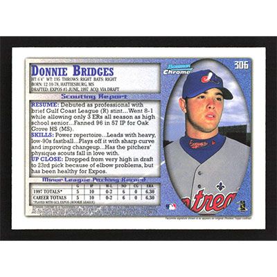 This is a 1998 Bowman Chrome Donnie Bridges baseball card. The card is #306 and pictures show condition.