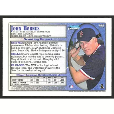 This is a 1998 Bowman Chrome John Barnes baseball card. The card is #363 and pictures show condition.