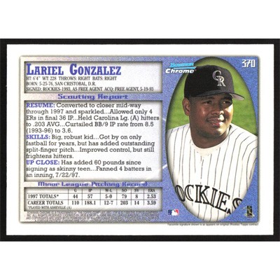 This is a 1998 Bowman Chrome Lariel Gonzalez baseball card. The card is #370 and pictures show condition.