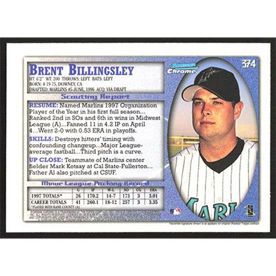 This is a 1998 Bowman Chrome Brent Billingsley baseball card. The card is #374 and pictures show condition.