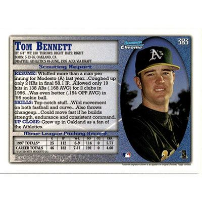This is a 1998 Bowman Chrome Tom Bennett baseball card. The card is #383 and pictures show condition.