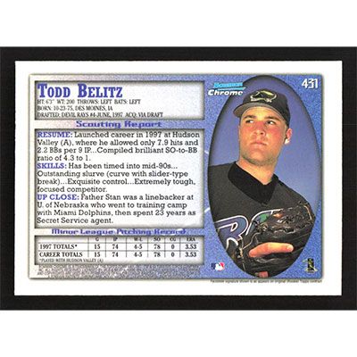 This is a 1998 Bowman Chrome Todd Belitz baseball card. The card is #431 and pictures show condition. Team(s): Tampa Bay Devil Rays Rookie Card (RC)