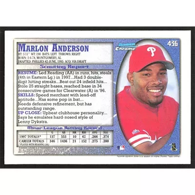 This is a 1998 Bowman Chrome Marlon Anderson baseball card. The card is #436 and pictures show condition.