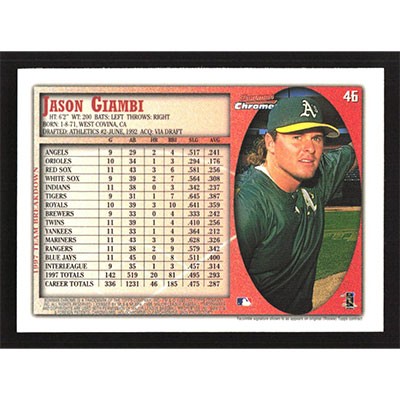 This is a 1998 Bowman Chrome Jason Giambi baseball card. The card is #46 and pictures show condition.