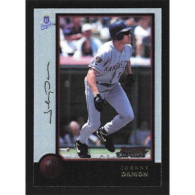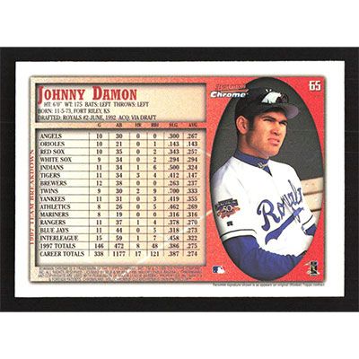 This is a 1998 Bowman Chrome Johnny Damon baseball card. The card is #65 and pictures show condition.