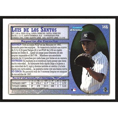 This is a 1998 Bowman Chrome International Luis de los Santos baseball card. The card is #146 and pictures show condition.