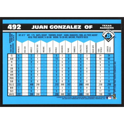 This is a 1998 Bowman Chrome Reprints Juan Gonzalez 1990 baseball card. The card is #23 and pictures show condition.