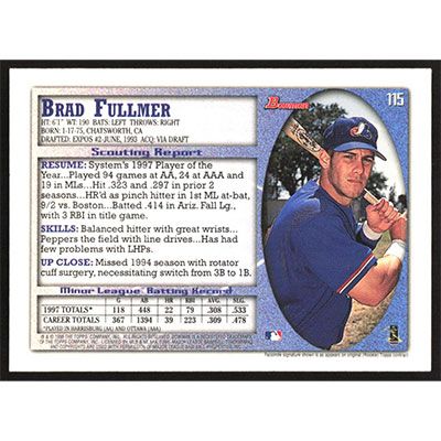 This is a 1998 Bowman International Brad Fullmer baseball card. The card is #115 and pictures show condition.