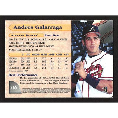 This is a 1998 Bowman's Best Andres Galarraga baseball card. The card is #100 and pictures show condition.