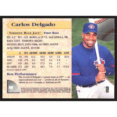 This is a 1998 Bowman's Best Carlos Delgado baseball card. The card is #86 and pictures show condition.