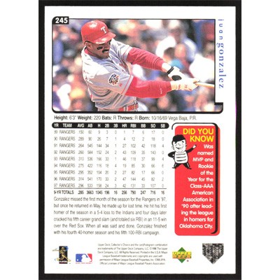 This is a 1998 Collector's Choice Juan Gonzalez baseball card. The card is #245 and pictures show condition.
