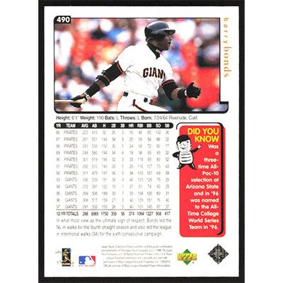 This is a 1998 Collector's Choice Barry Bonds baseball card. The card is #490 and pictures show condition.